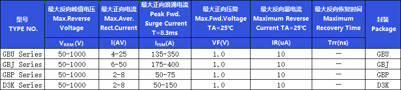 2.具有較大的通流能力;Max~50A,較強的浪涌能力:Max~400A,較高的反向電壓1000V,較低的正向電壓降:1.0-1.1V;
