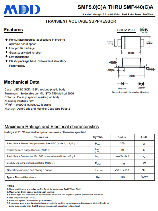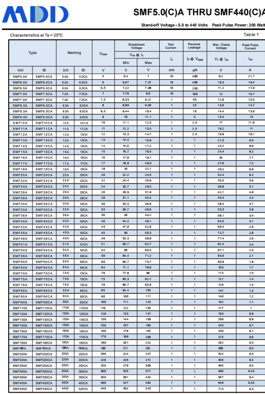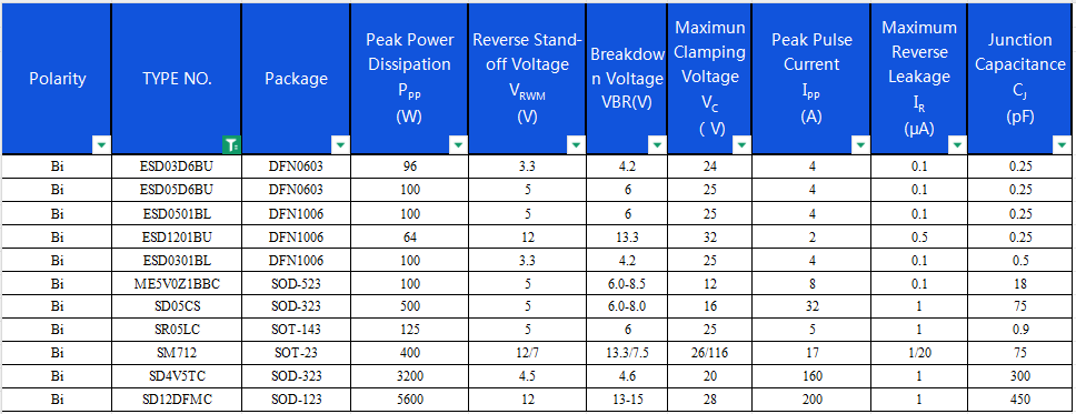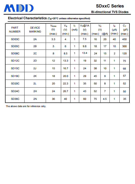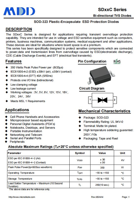 MDD的SDXXC系列雙向TVS二極管專為ESD防護設(shè)計,具有以下特性: