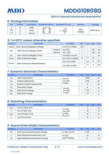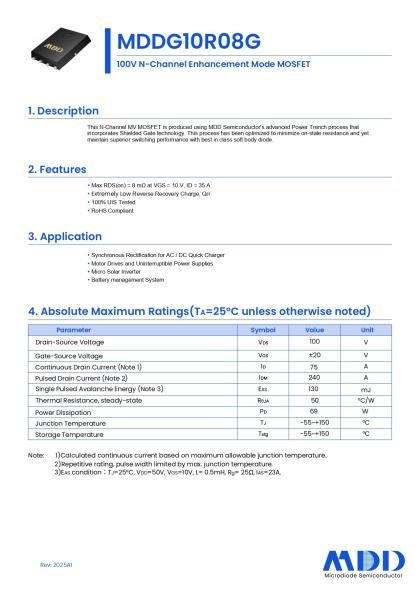在電源管理領(lǐng)域,高效、可靠的功率器件是提升系統(tǒng)性能的關(guān)鍵。MDD全新PowerTrench系列MOSFET,結(jié)合SGT屏蔽柵技術(shù),推出全新N溝道增強(qiáng)型MOSFET系列產(chǎn)品,其中MDDG10R08G采用PDFN5*6-8L封裝,符合RoHS標(biāo)準(zhǔn),以其卓越的開關(guān)性能與低導(dǎo)通電阻,成為同步整流、電機(jī)驅(qū)動(dòng)等應(yīng)用的理想選擇。