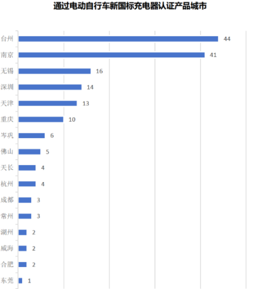 從通過(guò)認(rèn)證的產(chǎn)品地域分布來(lái)看,臺(tái)州和南京數(shù)量最多,分別為44款和41款;其次為無(wú)錫(16款)、深圳(14款)、天津(13款)和重慶(10款)??傮w來(lái)看,江浙地區(qū)在電動(dòng)自行車充電器認(rèn)證數(shù)量上處于領(lǐng)先地位,這與當(dāng)?shù)仉妱?dòng)自行車產(chǎn)業(yè)高度聚集密切相關(guān)。