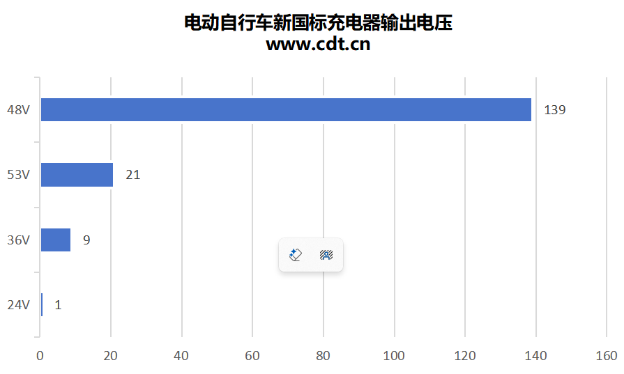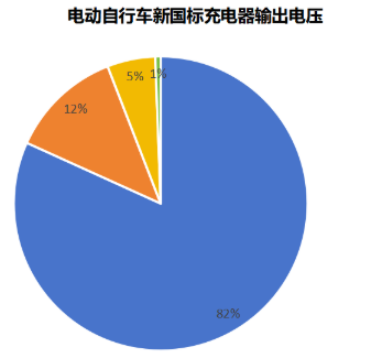 在通過(guò)新國(guó)標(biāo)3C認(rèn)證的電動(dòng)自行車用充電器中,其輸出電壓大致可分為53V、48V、36V、24V四種,所占比例分別為12%、82%、5%和1%。