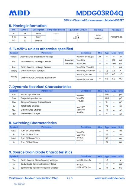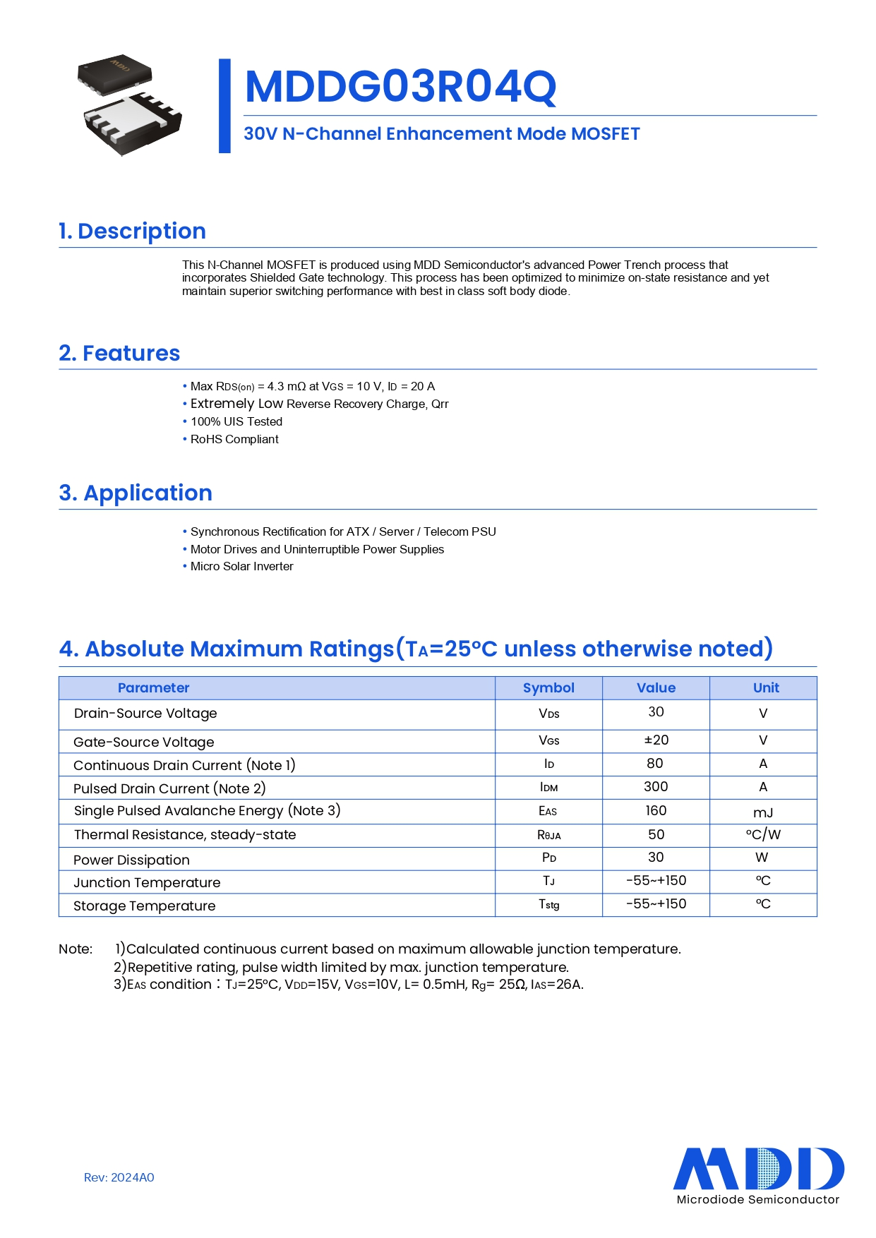 MDDG03R04Q采用MDD的Trench工藝,結(jié)合屏蔽柵結(jié)構(gòu),通過優(yōu)化載流子遷移路徑與電場分布,實(shí)現(xiàn):